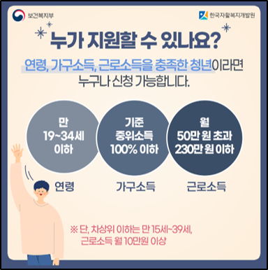 - 중위소득 50~100% 사이 19~34세 근로 청년은 매월 10만 원에서 50만 원을 저축하면 정부에서 월 10만 원을 지원합니다.